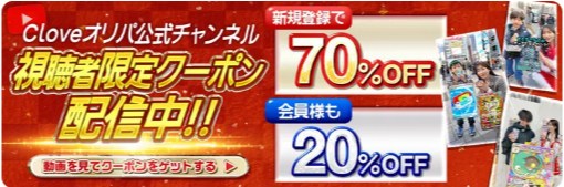 cloveオリパ公式youtubeでは、新規登録者にポイント70%オフで購入できるクーポンコードを配布しています。