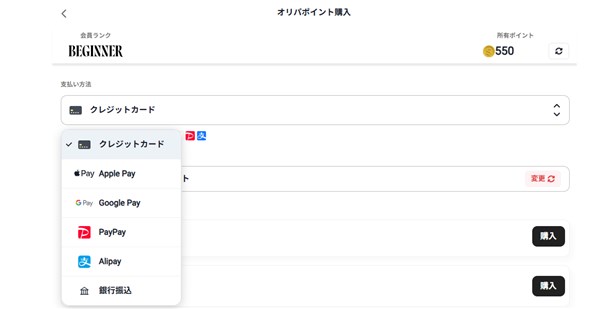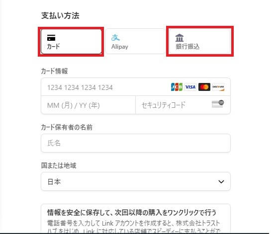 クレジットカード/Alipay/銀行振込から支払い方法を選択します。