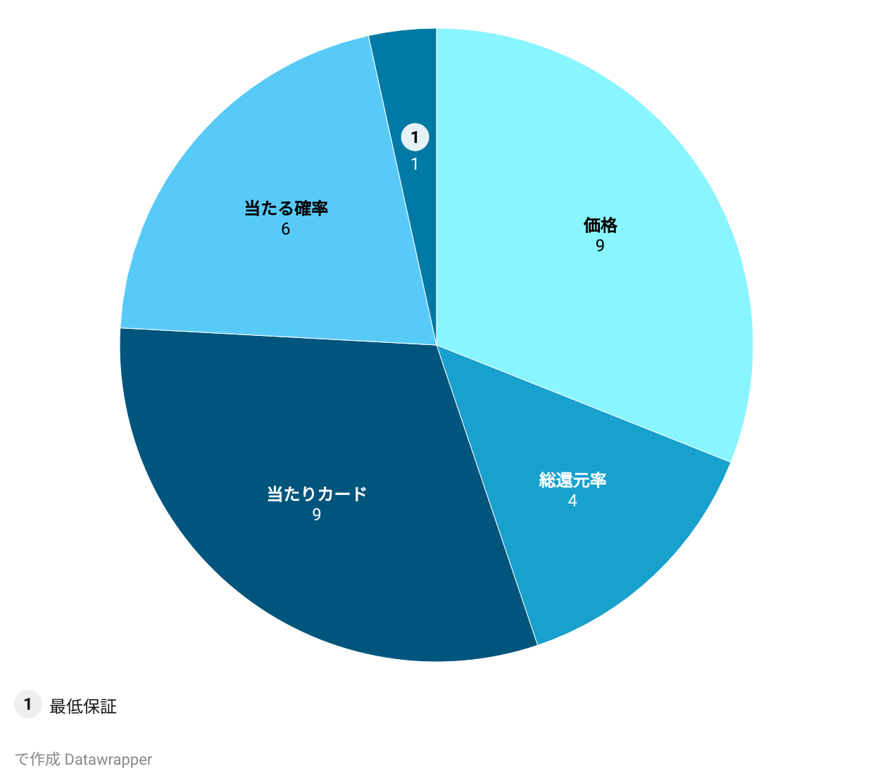 「価格」と「当たりカード」が特に重視されており、少ないコストで良いカードを狙いたいというユーザー心理が表れています。