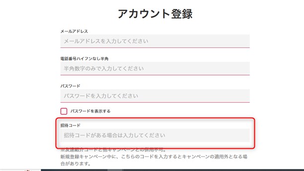 | 招待コード入力 | 300pt | 新規会員登録時に招待コードを入力してSMS認証を完了 |