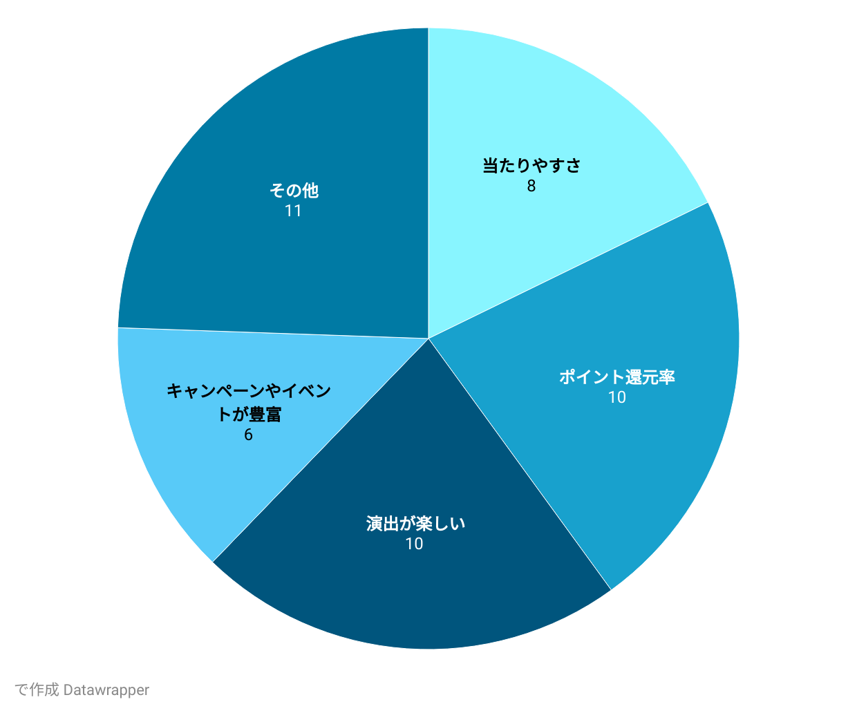 次いで「当たりやすさ」や「キャンペーンの多さ」なども支持されており、全体的に“当たりやすくて楽しい”印象を持たれているようです。
