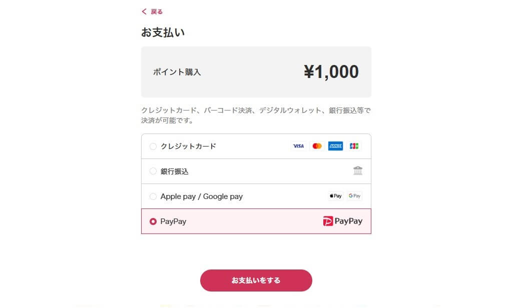 | 決済方法 | クレジットカード、銀行振込、 Paypay、Apple Pay、Google Pay、Amazon Pay、コンビニ、メルペイ、Paidy |
