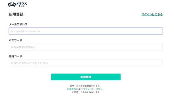 登録画面で、メールアドレスとパスワードを入力し、「新規登録」ボタンをクリックします。