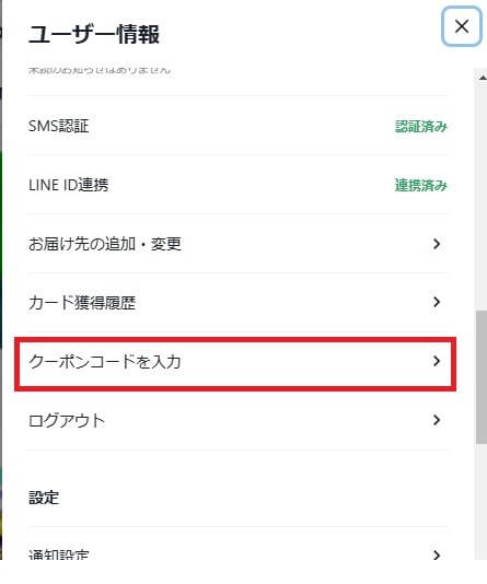 - マイページの「クーポンコードを入力」をタップ