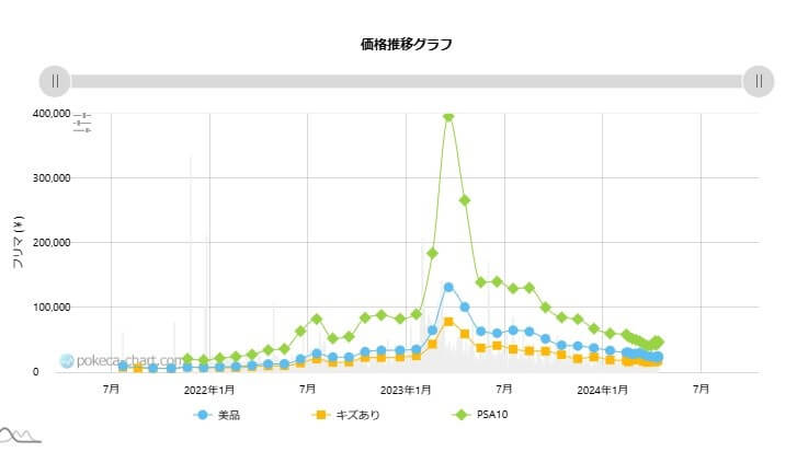 その後ポケカバブルの崩壊とともに価格は下落を続け、2024年7月現在は数万円で取引されています。