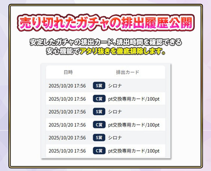 すべての排出履歴が確認できるため、透明性が高く、安心してガチャを楽しむことができます。