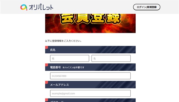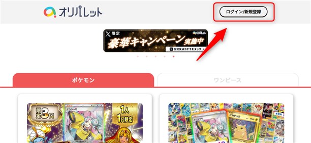 オリパレットの公式サイトに移動し、画面上部の「ログイン/新規登録」をクリックします。