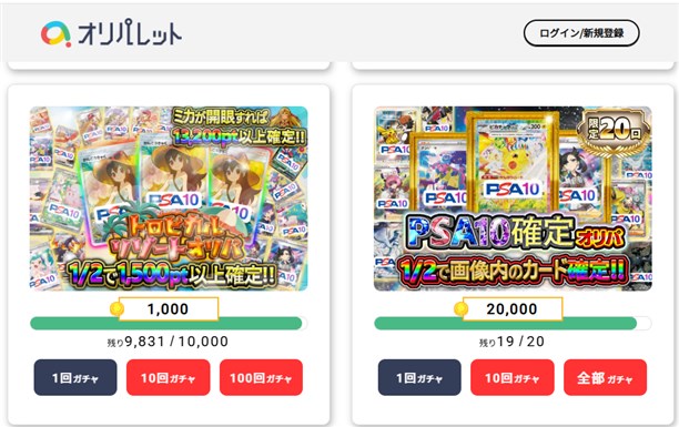 全100~1000口の小口オリパが多く、1人あたりの購入回数に制限があるものの、他のサービスと比較してレアカードの当選確率が高いです。