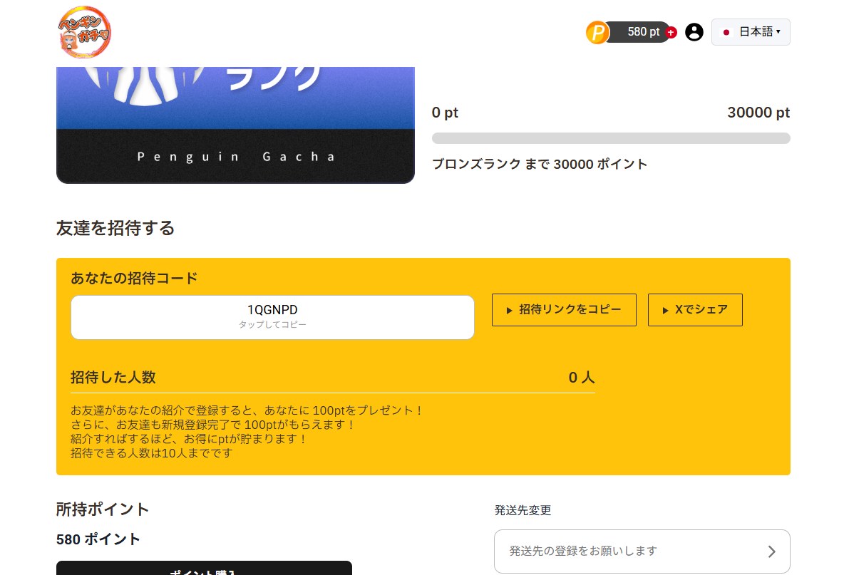 ペンギンガチャでは招待コード経由で登録すると、紹介した人・された人の両方に100ptが付与されます。