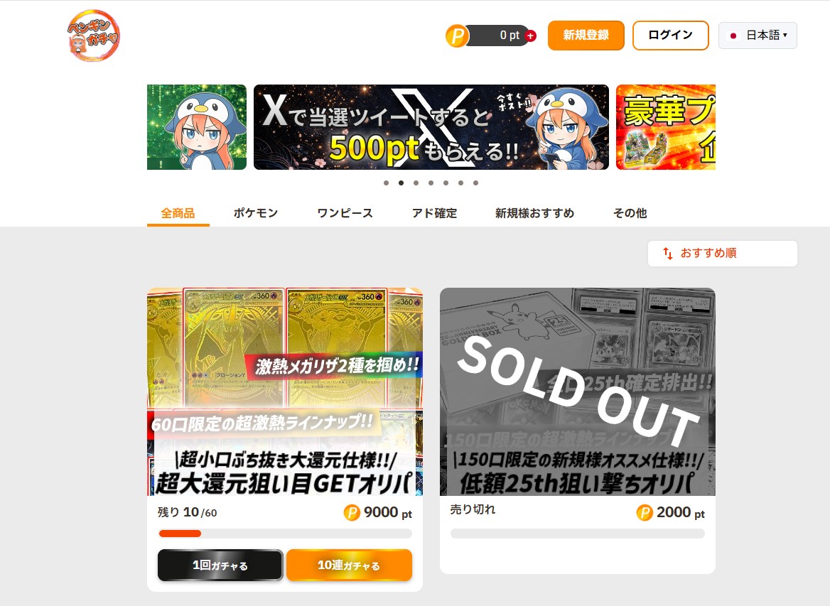 ペンギンガチャのオリパは福袋系の楽しさと当たりやすさ、独自の演出でユーザー体験を重視したオンラインオリパです。