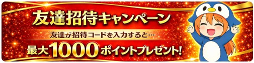 ペンギンガチャでは登録時に招待コードを入力すると100ptもらえるキャンペーン実施中です。
