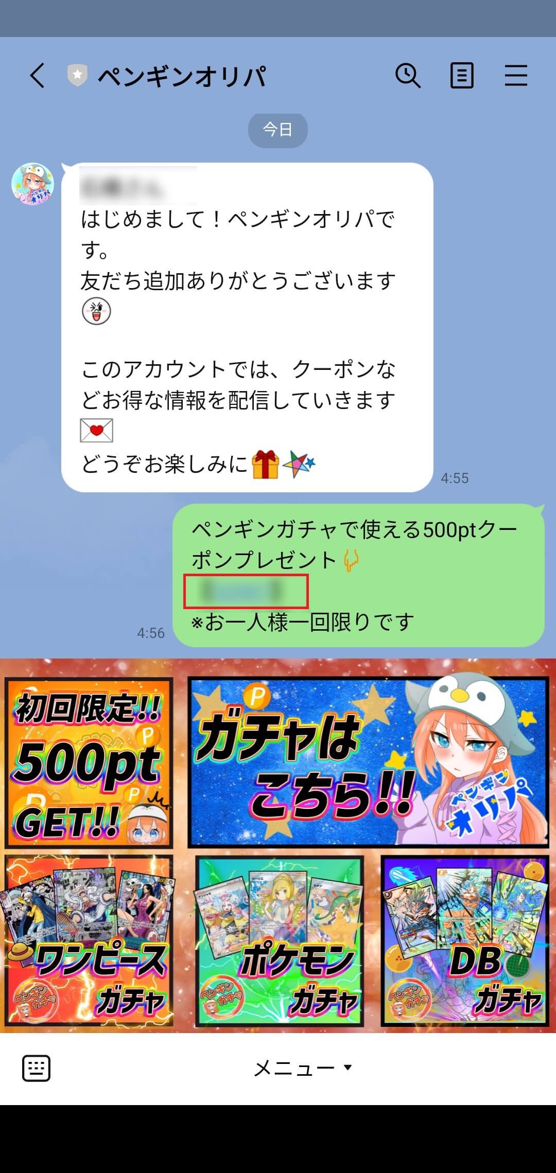 トーク画面で「初回限定!500pゲット」のバナーをタップするとコードが表示されます。