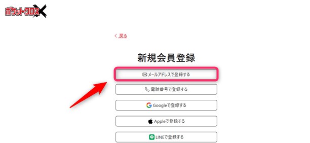 ポケットクロス公式サイトにアクセスして、「新規会員登録」をタップします。