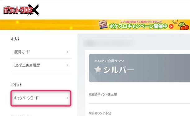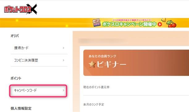 ポケットクロスにログイン後、「マイページ」ー「キャンペーンコード」をタップします。
