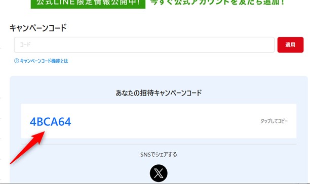 ログイン後、「マイページ」ー「キャンペーンコード」で確認できます。