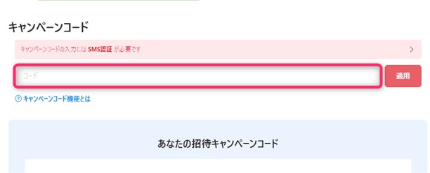 「キャンペーンコード」入力欄に、コピーした招待コードを貼り付けて、「適用」をタップします。