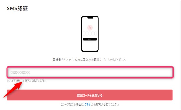 電話番号を入力し、「認証コードを送信する」をタップします。