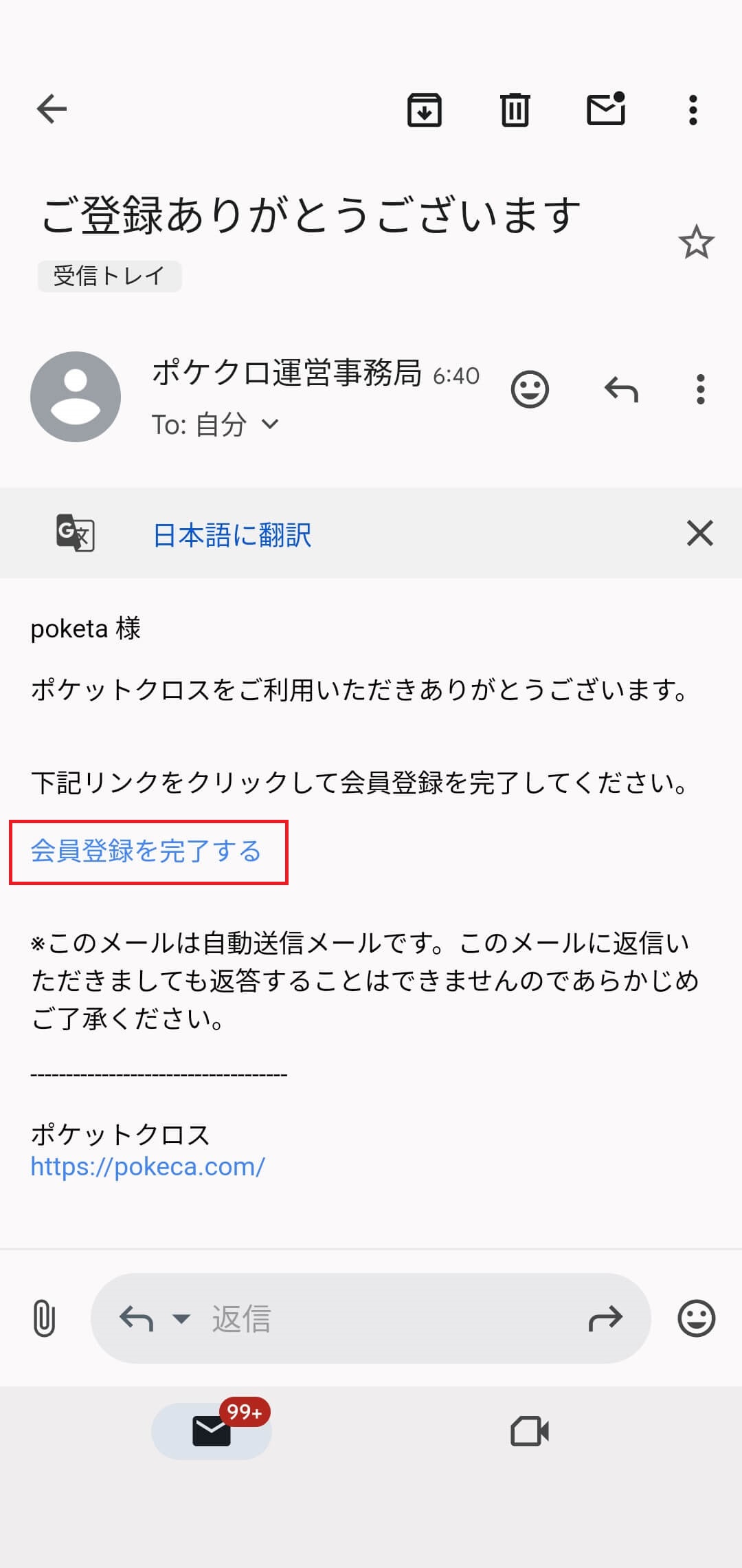 登録したメールアドレスに認証メールが届きますのでメールを開いて、「会員登録を完了する」をタップします。