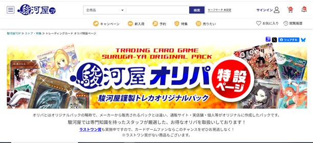 駿河屋は、ゲーム、古本、DVD、CD、トレカ、フィギュアなどを扱う通販ショップであり、そのオリパはゲーム・古本・DVD・CD・トレカ・フィギュアなど幅広い商品を取り扱う中での一部として提供されています。