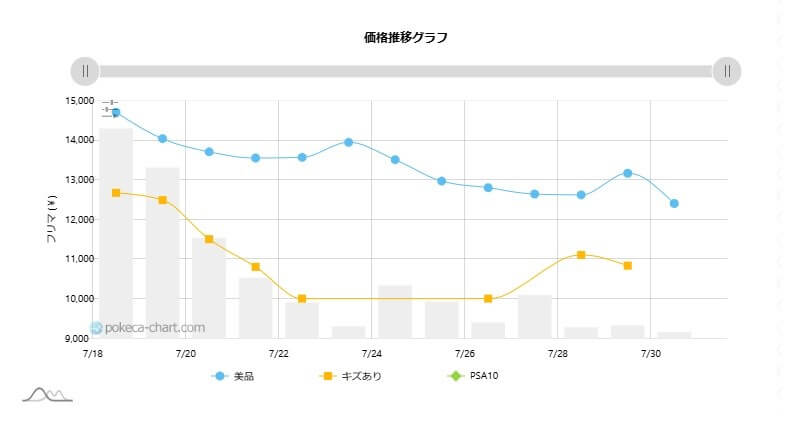 ポケカのタロSARは、2024年7月19日発売初動は美品で15000円前後、その後価格は下落し12000円前後で推移しています。