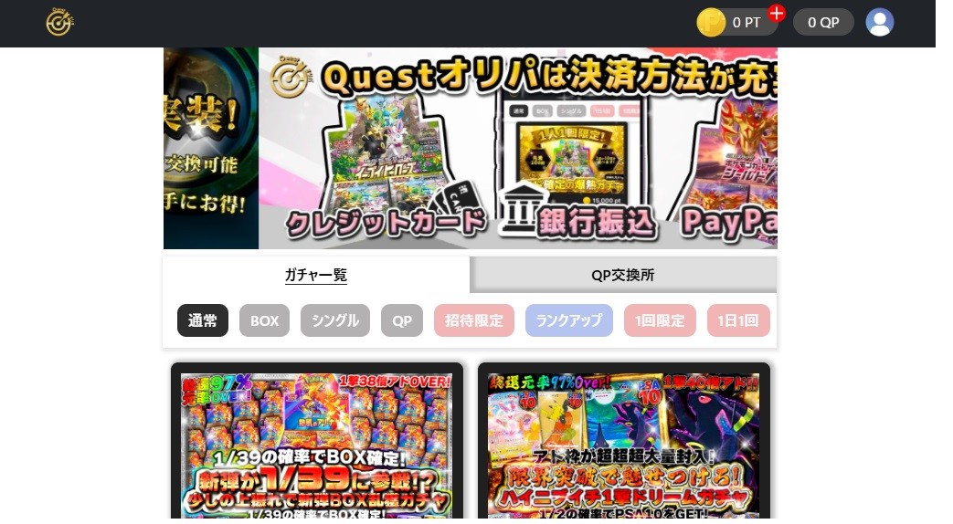 通常のオリパだけでなく、BOXやシングルカードが当たるガチャ、ランクアップガチャ、1回限定や1日1回限定のガチャなど、多彩な種類のガチャを提供しています。